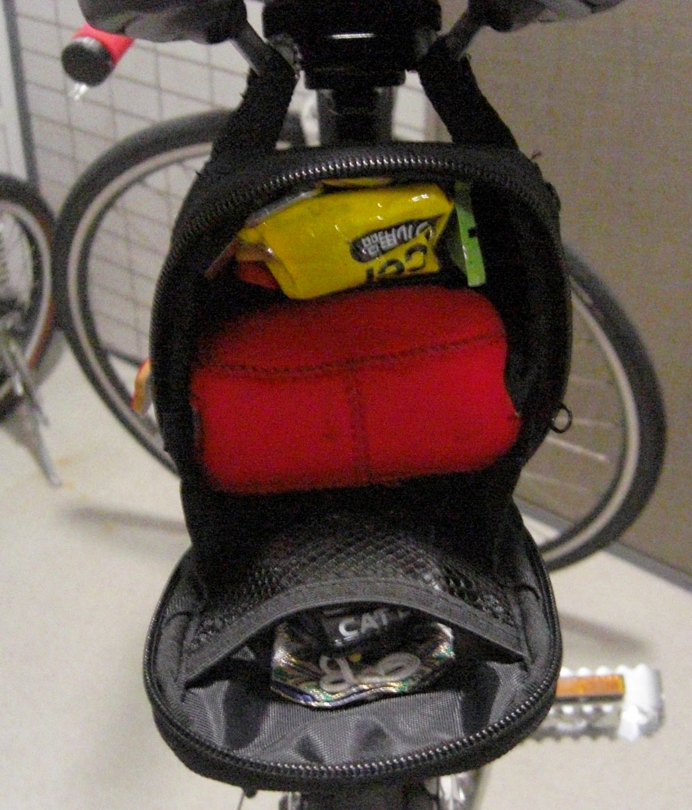 そしてさらに、サドルバックに格納します。このサドルバックには、パンク修理セット、レンチ、お守りなど盛りだくさんの中身です。